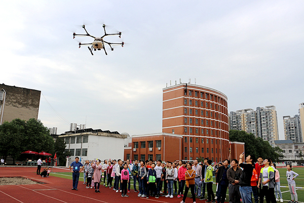 展示区里的无人机最博人眼球,数架个头大小不一的无人机整齐的排列展示,吸引了众多师生驻足观看。在工作人员的熟练操作下,一架农用无人机腾空而起,快速向运动场北边一棵大樟树飞去,蜻蜓一样悬停在树梢正上空喷洒雨雾,演示完喷洒农药后,又翱翔到运动场上空,随后稳稳的降落到展示区。